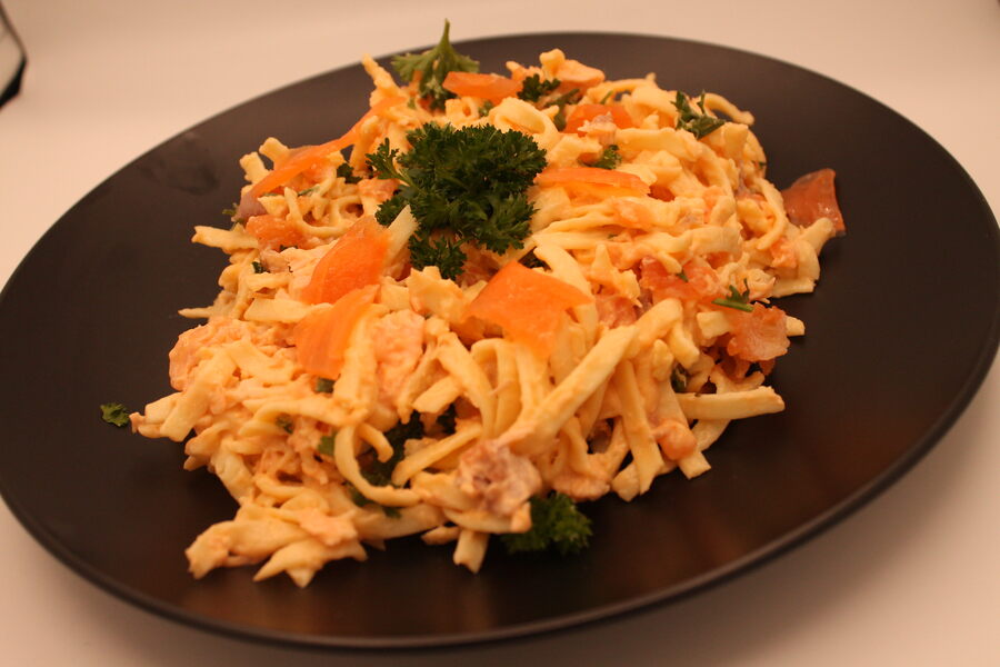 AANBIEDING Een heerlijke tagliatelle met een romige zalmsaus, gerookte en gekookte zalm.